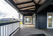 Первый этаж: кухня - столовая, гостиная со вторым светом, котельная и санузел. Выход на террасу, которая расположена по всеми периметру первого этажа дома;