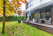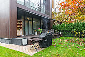 На 2,8 сотках ухоженный участок с туями и барбекю, зарядка для электромобилей.