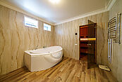 Приятным дополнением служит SPA-зона с электрической сауной от фирмы Harvia. Во внутренней отделке сауны использованы экологически чистые породы деревьев – ясень и липа. Установлена технологичная ванна с системой точечного гидромассажа.