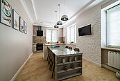 Внутренняя отделка выполнена с использованием только качественных и дорогостоящих материалов. Полы выложены декоративной плиткой и паркетной доской из массива дерева. Кухня выполнена на заказ и оснащена всей необходимой встроенной техникой ведущих мировых производителей (Zigmund & Shtain, NEFF, Liebherr). В дом заведены и разведены теплые полы от фирмы Rehau, оснащены системой «аквастоп». Сделаны выводы под систему кондиционирования. Под окнами установлены конвекторы. Лестница выполнена из натурального дерева (дуб).