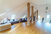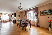 Дом построен в 2017 году и представлен в отделке «под ключ» с мебелью. В доме сбалансированы функциональность, практичность и комфорт. Во внутренней отделке преобладает дерево. Изюминкой дома является просторный мансардный этаж, который может быть целиком отведен для места отдыха всей семьи. Цоколь дома монолитный из бетона М400, наружные стены кирпичные, облицованные европейским кирпичом, кровельное покрытие – гибкая черепица. Толщина стен составляет 63 см.