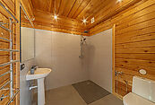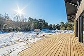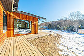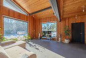 В архитектурном проекте данного дома нет ничего лишнего. Панорамное остекление в гостиной установлено с трех сторон практически без стеновых пролетов, что дарит совершенно невообразимое единение с природой – на участок прибегают белки, залетают лесные птицы, открывается потрясающий вид на лес. Находясь в данном доме, ощущается особенная умиротворенность. Дом подходит для круглогодичного проживания всей семьи.