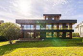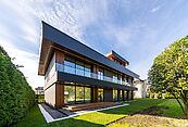 Первый этаж: гардеробная, гостевой санузел, спальня с санузлом, кухня - столовая - гостиная, техническая кухня с кладовой комнатой, постирочная, кабинет/спальня с санузлом, спальня для персонала со своим санузлом