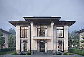 Архитектурный проект дома выполнен в современном стиле Райта. Фундамент дома железобетонный свайный с монолитным ростверком. Стены построены из керамических блоков POROTERM 51. Стропильная система кровли выполнена из сухого хвойного бруса, обработанного огнебиозащитным составом (ГОСТ 20022.6-93), покрыта черепицей BRAAS. Высота потолков составляет 3,3м. На первом и втором этаже есть террасы с стеклянным ограждением. Дом облицован натуральным камнем. Дом продается без отделки. Срок сдачи дома - август 2025 года.