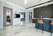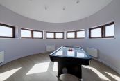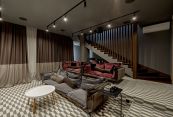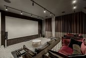 Первый этаж: холл, гостиная с выходом на террасу, столовая, кухня, спальня с санузлом, кинотеатр с лестницей на второй этаж (которая ведет в кабинет), гостевой санузел с зоной постирочной, гардеробная, котельная;