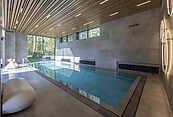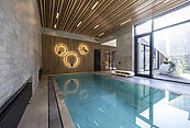 Первый этаж: холл, гардеробная, кухня-столовая-гостиная, гостевая спальня с санузлом и гардеробной, кабинет, бассейн, сауна, санузел, комната отдыха, блок для персонала (комната с санузлом), котельная гараж,