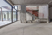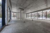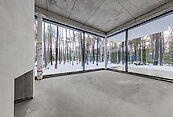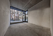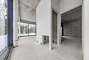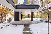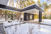Первый этаж: холл с проходной гардеробной и гостевым санузлом, кухня-гостиная с выходом на улицу к зоне барбекю, гостевая спальня с собственной ванной комнатой, техническая кухня, постирочная, серверная/кладовая, гараж на 3 м/м, котельная с входом с улицы и лестницей на второй этаж в блок персонала;