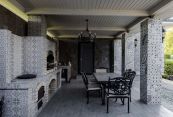 Первый этаж: кухня, гостиная, санузел, терраса, зона барбекю