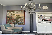 На первом этаже — просторная кухня-гостиная с выходом на участок, где утренний кофе приобретает особый вкус. Кухня: немецкая фирма ligron, раковина Blanco, подогрев посуды asko, плита Siemens, СВЧ asko, духовка asko, винный шкаф liebherr, холодильники Siemens. Зона кухни: витрина из шпона по индивидуальному заказу, стол BoConcept, стулья Calligaris. Кабинет спроектирован по индивидуальному проекту, отделка шпон, библиотека изготовлена на заказ, стол 19 век и стул 18 век антиквариат, телевизор, обои Wallquest Document США, люстры из бронзы ручной работы.