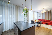 Фасад дома отделан клинкером и отличается оригинальными панорамными окнами, которые дарят большое количество света жильцам, и подсветкой, что придает дому особый шарм в вечернее время.
