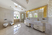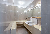 Цокольный этаж: спа зона с бассейном, хамам, баня на дровах с зоной отдыха и душевой и выходом во двор, санузел, кухня для персонала, две комнаты свободного назначения, прачечная, щитовая, котельная, серверная, две кладовые комнаты