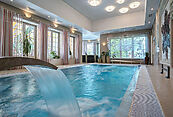 Первый этаж: гостиная с камином и выходом на террасу, кухня, столовая, гостевая комната с ванной комнатой, холл, бассейн, сауна, санузел, джакузи, джакузи на террасе, гараж на 3 авто;