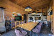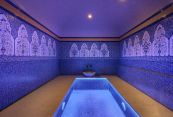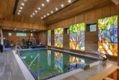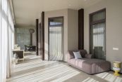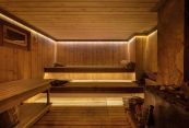 Первый этаж: бассейн 9*4 м с противотоком, джакузи, русская баня на дровах, хаммам, две купели, раздевалка с душевой, комната отдыха с камином, помещение под барбекю и большая терраса на улице.