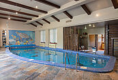 Первый этаж: прихожая, гардеробная, холл, гостиная, кухня-столовая, кладовая, кабинет, зимний сад, терраса, бассейн, русская баня, раздевалка, гостевая спальня, гардеробная, санузел