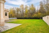 Ровный солнечный участок правильной формы примыкает к лесному массиву. Сделан дренаж, выведены гидророзетки для полива, уложен газон. Забор выполнен в едином стиле с домом. Въездная зона и дорожки вымощены брусчаткой. На участке установлены периметральные системы видеонаблюдения.