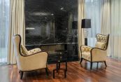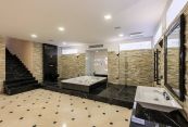Благодаря высоким потолкам и панорамному остеклению в доме много воздуха и света. Над проектом работал профессиональный архитектор, выполнен дорогой и качественный ремонт, в отделке использованы ценные экзотические породы дерева и натуральный мрамор.