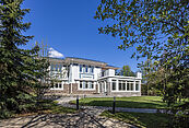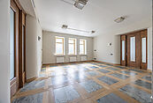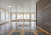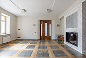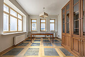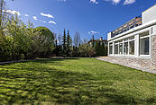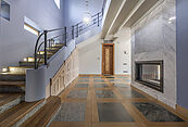 Внутреннее пространство вмещает просторную столовую с большим столом и панорамными окнами, уютную гостиную с двухсторонним мраморным камином, 4 спальни, 1 кабинет и сауну.