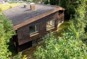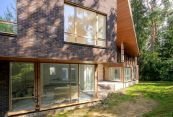 Фасад дома отделан клинкерным кирпичом, мрамором и лиственницей. Фундамент и перекрытия выполнены из ж/б монолита, стены из кирпича. Крыша - мягкая черепица.