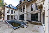 Цокольный этаж: помещение ценных вещей, помещение для хранения шуб, винная, четыре кладовые комнаты, помещение для оборудования бассейна, котельная, помещение вентиляционного оборудования, электрощитовая, коридор