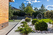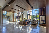 Первый этаж: кухня-столовая, гостиная с панорамным камином, кабинет, гостевая спальня, сауна, купель, комната отдыха, постирочная, бойлерная, три санузла, террасы и входные группы;