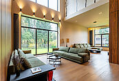 Ощущение пространства в доме обеспечивает большая площадь остекления и высота потолков в комнатах от 3,5 до 7,2 м.