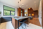 Общественная зона: Полностью укомплектованная мебелью гостиная-столовая-кухня - единое пространство со вторым светом, общей площадью 115 кв. м и объемом - 570 куб. м (выделено 5 функциональных зон: медиа зона с ТВ и дровяным камином, лаунж зона с двумя большими диванами, столовая со столом на 8 персон (с возможностью увеличения до 20), зона бара с двумя сервантами и барной стойкой, парадная кухня с островом 20 кв. м (с доступом в рабочую кухню 12 кв. м)). Окна этого пространства смотрят на восток, юг и запад. Блок свободного назначения с санузлом и сауной (общая площадь блока 37 кв. м, комната может использоваться как игровая, СПА, спортзал, кинотеатр, бильярдная и т.д.). Крытая терраса с видом на лес с доступом из кухни и столовой. Хозяйский санузел первого этажа, оснащенный умывальником, унитазом, биде и писсуаром.