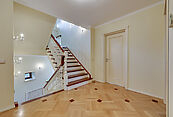 Первый этаж: прихожая, гардеробная, гостевой санузел с душевой, кухня-столовая с выходом на летнюю террасу, гостиная с камином, комната/кабинет, постирочная, гараж на 2 м/м., котельная с отдельным входом, блок для персонала;