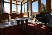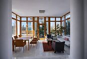 Первый этаж: прихожая, гостиная с камином, кухня-столовая, вторая гостиная-зимний сад, гостевой санузел, комната-кабинет;