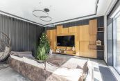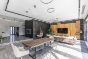 В доме выполнена отделка по индивидуальному проекту, в современном стиле с использованием дорогих, качественных материалов. Благодаря высоким потолкам и панорамными окнам пространство наполнено воздухом и светом. Эксклюзивные дизайнерские решения придают уникальность внутреннему пространству дома.