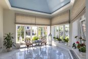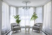 На первом этаже располагается гостиная с камином и зоной отдыха, окружённой с трёх сторон большими окнами. Столовая окружена тремя большими эркерными окнами и объединена с кухней. Столовая выходит в зимний сад с летней террасой. Кабинет расположен в уединённой части дома. На на втором этаже расположены 4 спальни. Мастер-спальня с гардеробной и ванной комнатой – общей с детской спальней. Две спальные комнаты расположены рядом с просторной ванной. Одна из спален выходит на балкон. Все спальные комнаты объединяет просторный холл. Для большего удобства владельцев, гараж на два авто, подсобное помещение, кладовая, постирочная и котельная вынесены в отдельное крыло первого этажа.