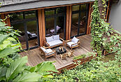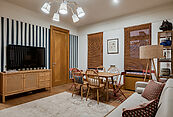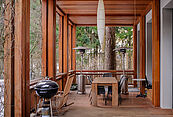 Архитектура дома — авторский проект Федора Арзаманова и бюро «Акант», воплощающий эстетику современного стиля. Высокие потолки и панорамные окна наполняют пространство светом, создавая ощущение легкости и простора. В отделке использованы редкие и ценные материалы: мрамор, порфир, красное африканское дерево анегри с глубоким янтарным оттенком. Обстановка выдержана в гармоничном сочетании современного и винтажного дизайна: мебель Gervasoni, кухня Bulthaup, дизайнерские светильники.