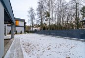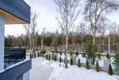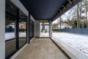 Первый этаж: гостиная-столовая с панорамным остеклением и выходом на открытую террасу, прихожая, гостевая комната, санузел, гардеробная, бойлерная, кладовая, гараж на два автомобиля.