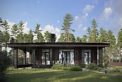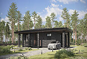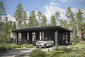 Стиль выражен через четкие горизонтальные линии, выходящие за пределы конструкции, и 4-скатную крышу с низким коньком и широкими свесами. Это создает эффект почти плоской поверхности, усиливая гармонию с природой.