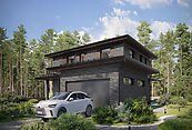 Первый этаж: крыльцо, прихожая, гардеробная, кухня, гостиная, столовая, санузел, спальня, холл, кабинет, сауна, кладовая, постирочная, терраса, гараж;